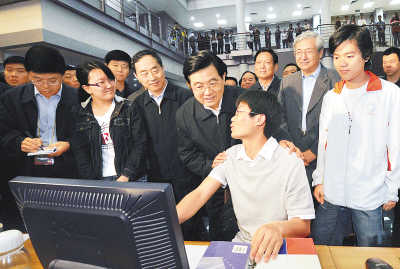 5月3日,在北京大學(xué)建校110周年之際,中共中央總書(shū)記、國(guó)家主席胡錦濤來(lái)到北京大學(xué)考察。這是胡錦濤在學(xué)校圖書(shū)館了解學(xué)生上網(wǎng)檢索資料的情況。