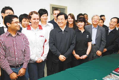 5月3日,在北京大學(xué)建校110周年之際,中共中央總書(shū)記、國(guó)家主席胡錦濤來(lái)到北京大學(xué)考察。圖為胡錦濤在學(xué)生宿舍樓同部分外國(guó)留學(xué)生親切交談。