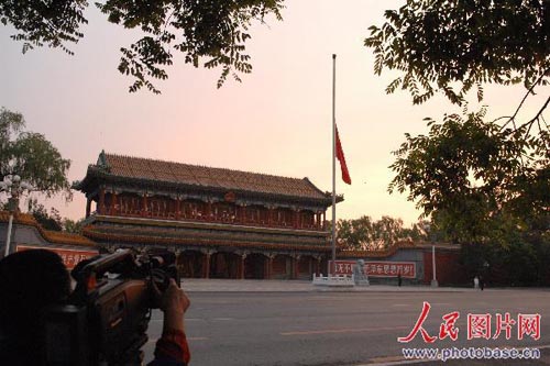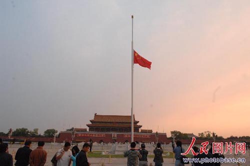 5月19日4時58分,北京天安門廣場在正常的升旗儀式后下半旗,以表達全國各族人民對四川汶川大地震遇難同胞的深切哀悼。