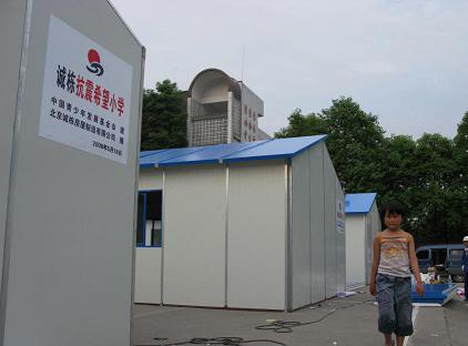 人民網軍事在線四川綿竹5月20日電 今天,由北京城棟房屋制造有限公司捐建,經過中國青少年基金會工作人員、祖國各地匯集到災區的逾百名志愿者及第二炮兵工程技術總隊官兵長達16個小時的不懈努力,全國第一所抗震希望小學在四川綿竹市遵道鎮落成,停課10天的遵道鎮中心小學,又傳來了朗朗的讀書聲,這也是全國第一所抗震希望小學。