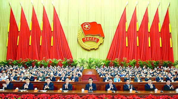 昨日,中國共產主義青年團第十六次全國代表大會在北京人民大會堂開幕。胡錦濤、吳邦國、溫家寶、賈慶林、李長春、習近平、李克強、賀國強、周永康等在主席臺就座,祝賀大會召開。 (新華社發)