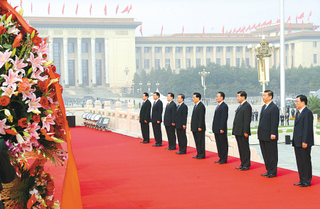 ?。箷r57分,胡錦濤、吳邦國、溫家寶、賈慶林、李長春、習近平、李克強、賀國強、周永康等黨和國家領導人步行來到各界代表方陣前,出席向人民英雄紀念碑敬獻花籃儀式。