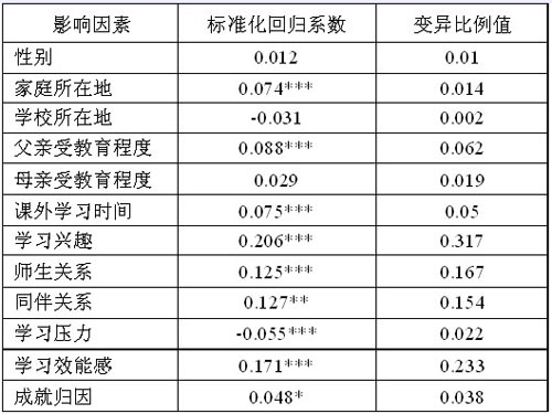 為了進一步分析不同影響因素對學業水平的影響,我們把問卷調查中涉及的各個變量與學業水平進行了回歸分析,結果顯示:在問卷所有的變量中,除性別、學校所在地、母親受教育程度外,其他變量對成績的預測均達到顯著(見表1,其中,*表示在0.05水平上達到顯著,**表示在0.01水平上達到顯著,***表示在0.001水平上達到顯著)。