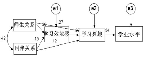上述回歸分析表明,學業水平影響因素主要體現在學習興趣、學習效能感、師生關系、同伴關系上,在此主要將這幾個因素納入模型,經過調整和擬合度檢驗,得出了結果(見圖1)。